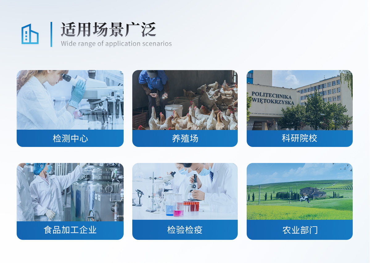 該儀器廣泛應(yīng)用于食藥監(jiān)局、衛(wèi)生監(jiān)督部門(mén)、農(nóng)業(yè)部門(mén)、商業(yè)系統(tǒng)養(yǎng)殖場(chǎng)、屠宰場(chǎng)、食品肉產(chǎn)品深加工企業(yè)、畜牧獸醫(yī)、檢驗(yàn)檢疫部門(mén)、食品生產(chǎn)企業(yè)、農(nóng)副產(chǎn)品批發(fā)市場(chǎng)、農(nóng)業(yè)生產(chǎn)基地、超市、餐廳、高教院校、食堂等單位部門(mén)對(duì)食品中的不安全指標(biāo)進(jìn)行監(jiān)測(cè)使用。