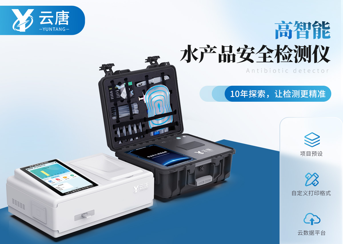 山東云唐智能科技有限公司生產(chǎn)的水產(chǎn)品安全檢測(cè)儀可適用于魚(yú)、蝦等水產(chǎn)中孔雀石綠、氯霉素、硝基呋喃類:呋喃唑酮(AOZ)、呋喃它酮( AMOZ )、呋喃妥因(AHD)、呋喃西林(SEM)、呋喃那斯、磺胺類、激素類、四環(huán)素類、金霉素、土霉素、甲砜霉素、氟苯尼考、喹諾酮類藥物:噁喹酸、諾氟沙星、恩諾沙星、環(huán)丙沙星、氧氟沙星等藥物殘留的定性檢測(cè)